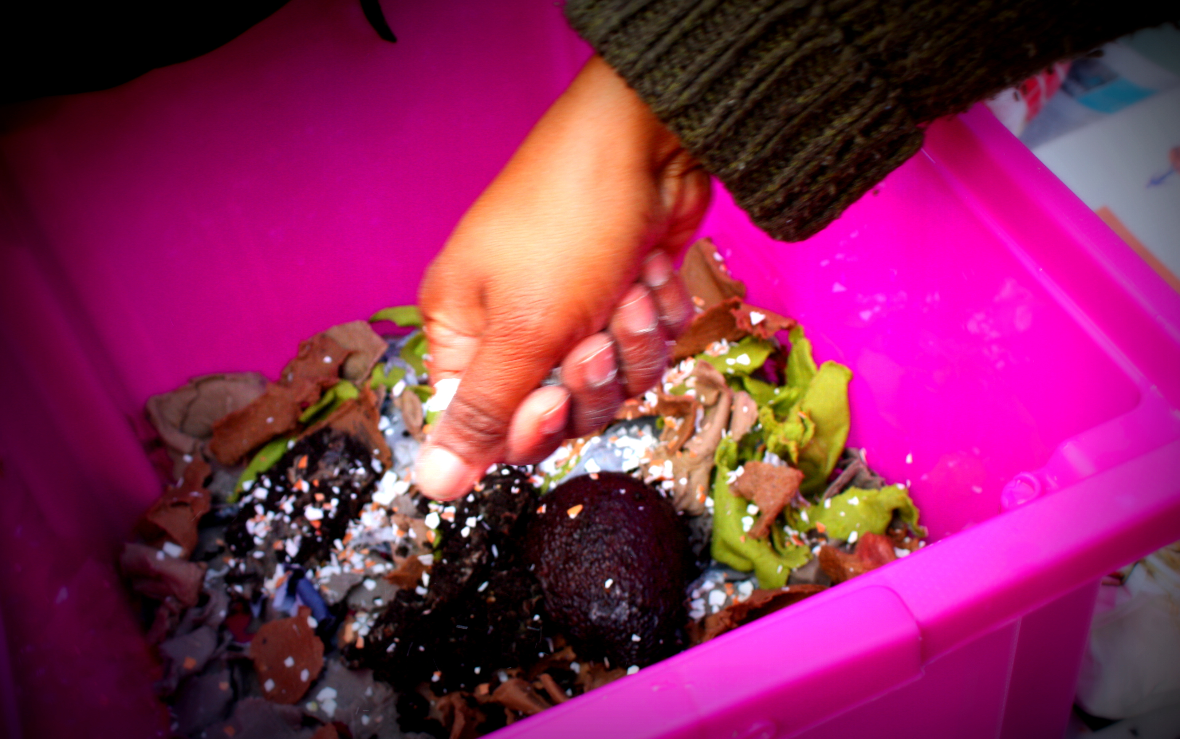 • The right amount of food: too much may invite other organisms to the bin; too little will force the worms to recycle their own castings (which is toxic for the worms)