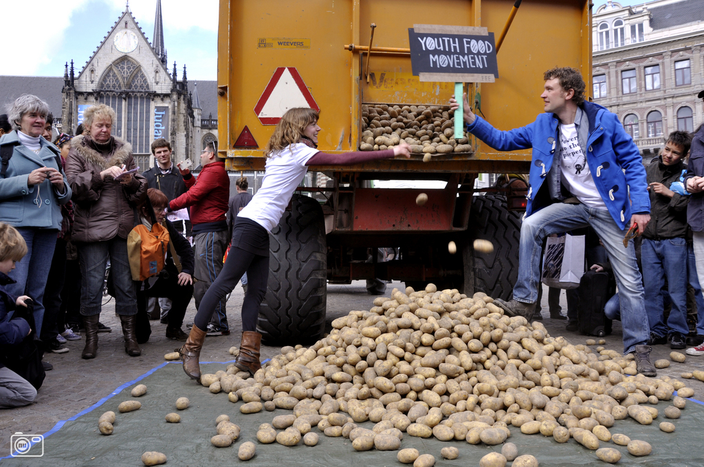 130113-Power-to-the-pieperTo draw attention to these messy logistics, last April (2012) the Amsterdam-based Youth Food Movement organized a potato dumping in central Amsterdam to draw attention to the issue – appropriately called “Power to the Pieper” (potato in Dutch). Working with a local organic farmer, a whole truckload of potatoes were brought in and dumped at Dam Square. Prior to the event, people were invited to attend the food dumping – to come and get free, local and organic potatoes. (As much as they could fit on their bike that is!) The day of, passersby were welcomed as well, so long as they had a bag to collect the potatoes.