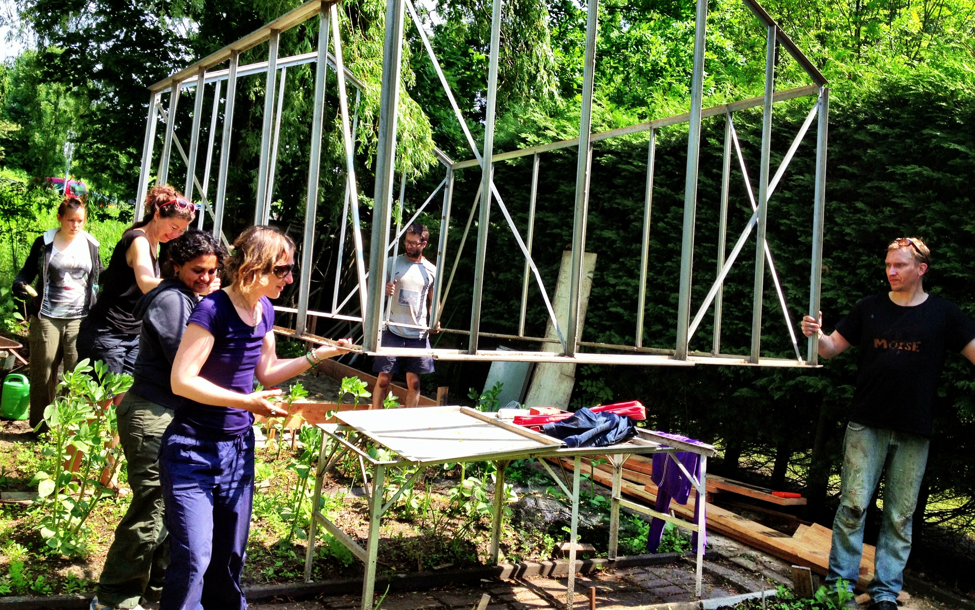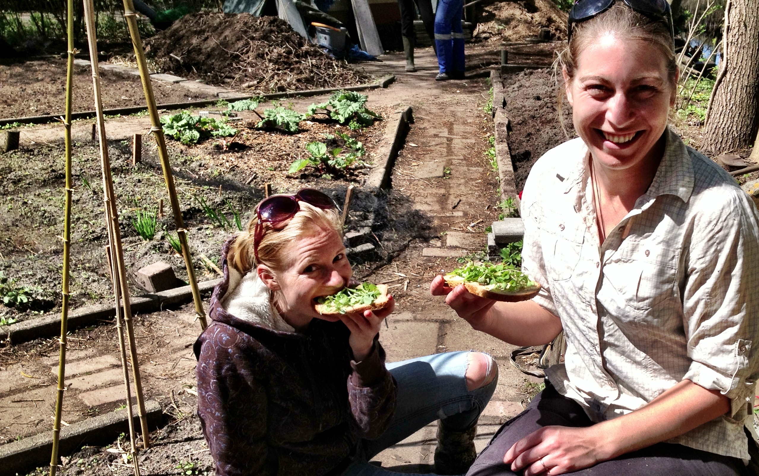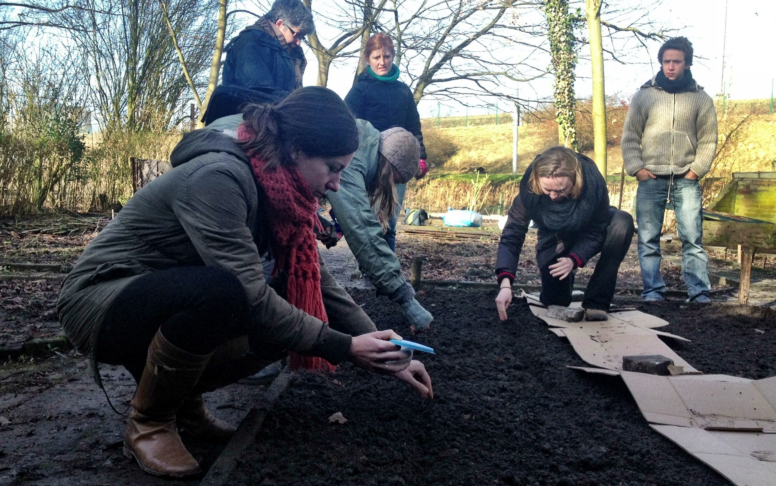 The beginning of the season… (February 2013)From empty fields to gorgeous green vines, salads, berries, peas and herbs in a few months was impressive. (August 2013)Turning the beds over was an arduous task: sometimes in the rain when the claylike soil was heavy and cumbersome; sometimes when the air temperatures were well below freezing and the frozen Earth was less inviting to our shovels. But we persisted, carefully turning every bed, from January- April 2013. (This photo and the finch: Barbara Pavie. All other photos by the author.)Biodynamic Bed: We planted Phacelia as a cover crop/ green manure to keep the soil healthy before the growing season. We learned to plant by the cycles of the moon and that there are 4 (rotating) crop groups: roots, leafs, fruit and flower. When you plant depends on the Earth signs – each crop group has a different planting and sowing time. (February 2013)Seed Saving Workshop: Learning about how to save different types of seeds, for example that carrots take two years in order to save seeds, and to be aware o possible cross-pollination of other seed types. We also discussed the larger geopolitical issues surrounding seed saving and several gardeners attended the Dutch Seed Exchange – Reclaim the Seeds – in early spring. (February 2013)Dye Plants Workshop: Learning how to grow and use plant-based dyes for textiles with a local gardener, artist and textile producer. (February 2013)Permaculture Bed: measuring to see how far apart to plant the fava beans and spinach. (March 2013)Sunshine returns to plant the biodynamic bed… (April 2013)Adding “preparations” to the biodynamic bed (April 2013)Finally gardening in T-shirts, at least some of us! (Late April 2013)Jumping on the Hugelkultur to compact it, before covering it with soil. (May 2013)While the season started slowly, we finally enjoyed the first garden treats! (May 2013)Watching the garden grow… (June 2013)We adopted a used greenhouse, which took a bit of work and logistics, but finally it is up, ready & looking great, complete with its very own rocket stove! (June 2013)Children’s Garden Bed: Happy harvesters (June 2013)One of a gardener’s best friends…Children’s Garden Bed: Getting the gardeners started young. (June 2013)Heritage Vegetables Bed: Comparing notes on urban agriculture in the Netherlands and China. (June 2013)Heritage Vegetables Bed: Forgotten potatoes, colourful peas and herbs; this bed also included Swiss Chard. Good for a city plot or a balcony… hardy, abundant, healthy, beautiful and delicious. (Harvested all summer long)Missing my summer meals…Composting & the Hugelkultur: From a pile of logs and garden debris, our hugelkultur transformed into a worthy pumpkin patch. (August 2013)End of Season Harvest party (September 2013)Harvest Celebrations (September 2013)Here we go again… planting a cover crop to be ready for the next season (October 2013)