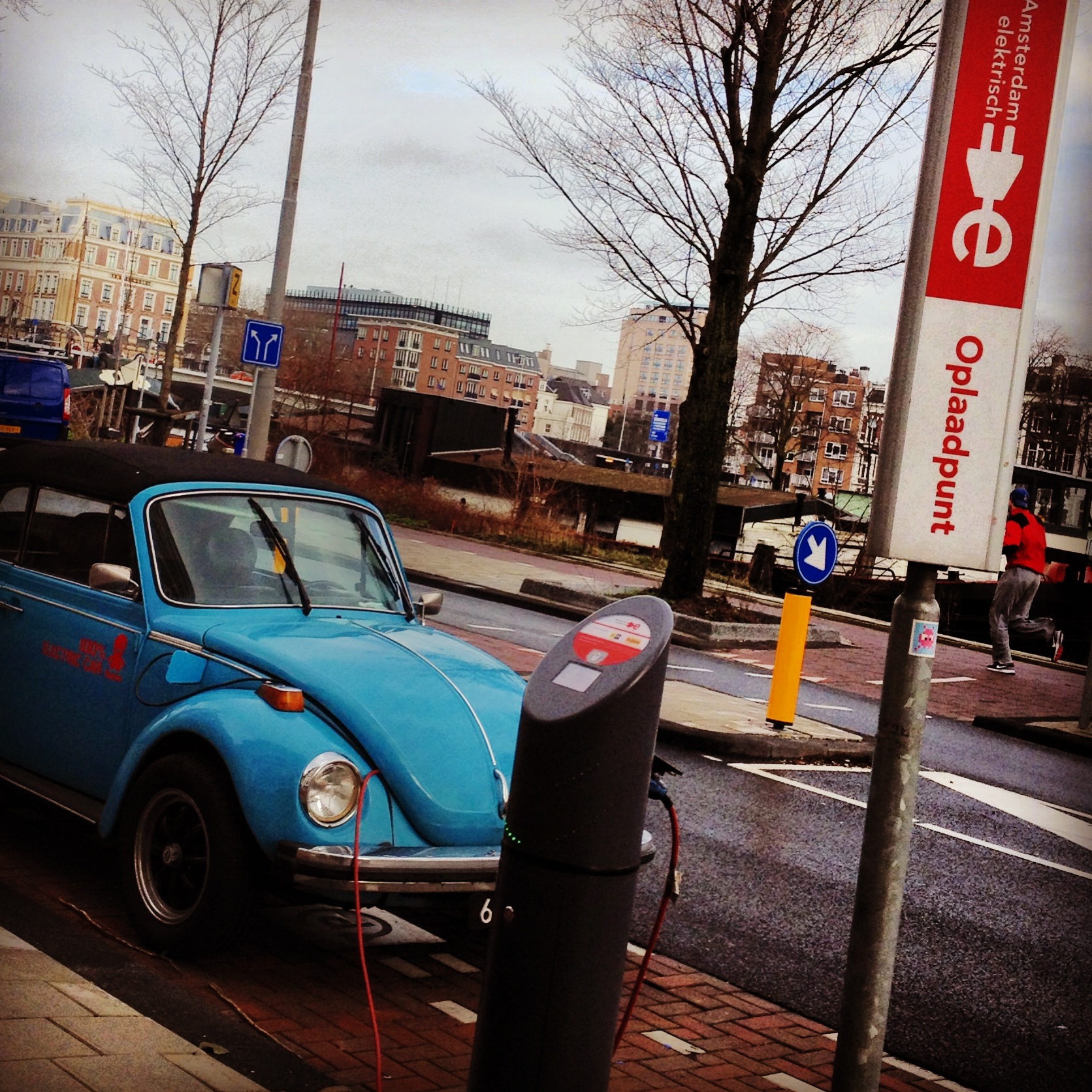 IMG_2594An avid city cyclist, I must admit: there is one automobile trend that has caught my attention – electric cars. While countless cities are beginning to provide better electronic mobility infrastructure and access, Amsterdam is quite literally leading the “charge”.  The city’s e-mobility scheme has been acknowledged in both the Korean Times and the New York Times, which highlight Amsterdam’s (and the Netherlands’) role in facilitating the electric car revolution. NYT states: “… to encourage electric driving, the Netherlands is developing a rapidly expanding national grid of charging stations in cities and along highways; and Amsterdam offers owners of electric vehicles free street parking and charging.”  Did someone say free?  Who doesn’t like free parking? And better yet, free charging!  Oh! Free from the bondage of petrol purchase! Yes: free charging stations, which generally employ green (e.g. wind or solar) electricity.