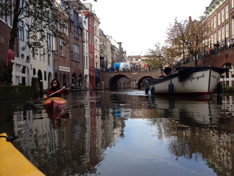In my continuous quest to find “nature in the city” in cities like Seattle, Stockholm or Seoul, Utrecht offers a distinctly Dutch twist. After all, where else can one kayak next to ancient canal-side warehouses, stare up to medieval towers, watch cyclists bounce over brick paths or enjoy falling leaves cluttering murky waters. While Amsterdam is famous for its boat rides, a kayaker has to compete with motorboats and giant tourist barges that dominate the waters. Utrecht’s more relaxed pace is suitable for the kayak. And with fewer canals, it’s harder to get lost. Still, there are enough waterways to explore for shorter or longer tours.