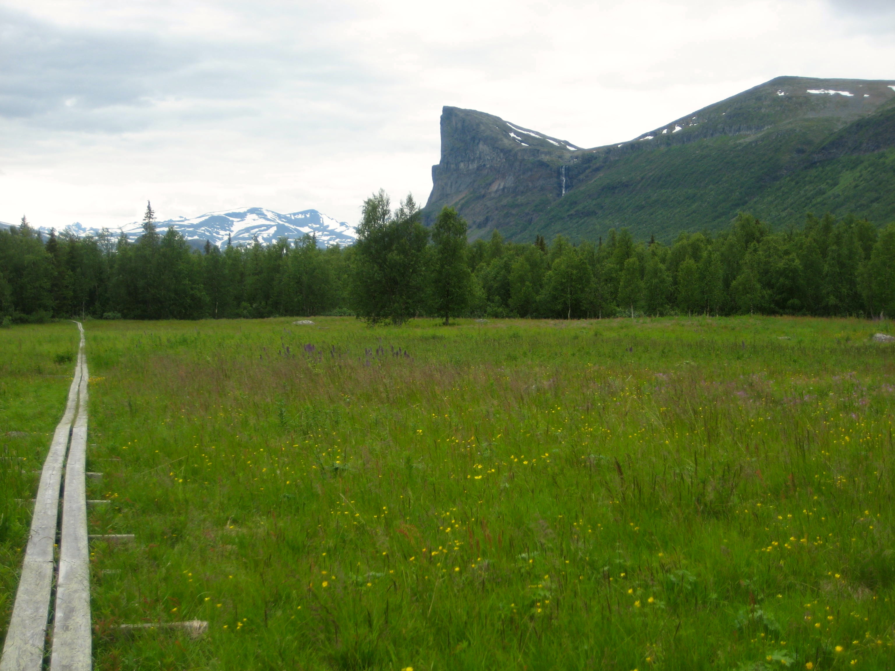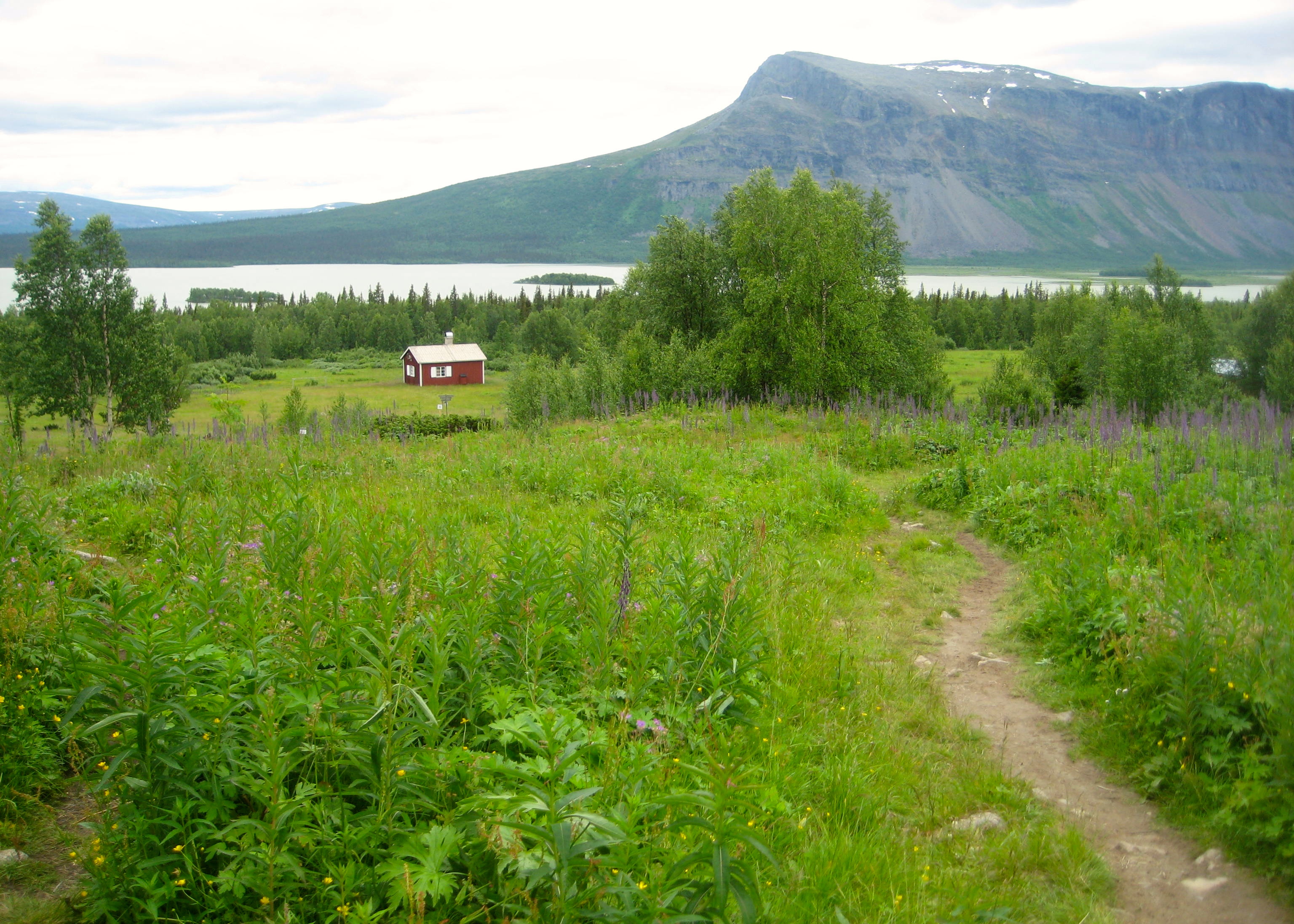 IMG_9085Two backpacks, 2 friends, a cook stove, a tent, and just the right clothing to stay warm, dry and (somewhat) mosquito-proof as we trek circa 250 km from Kvikkjokk to Saltoluokta to Kebnekaise – Sweden’s highest point at 2106 meters. My back hurts from lugging my 2-week existence hoisted on my 2 shoulders; but I become stronger – especially as our foodstuffs diminish and when I learn (thanks to my friend) to adjust my backpack straps correctly. Jokingly, we keep reminding ourselves, “This is summer” as we pull on another layer for warmth or to hold back the wind or rain. (Note: most of our photos were taken on the few days of sunshine to capture the area’s full magic…) Still, trekking Kungsleden in July (in the rain or shine) has benefits: long daylight hours make setting up camp easier, while providing a break from the snows that blanket the region for over half the year.