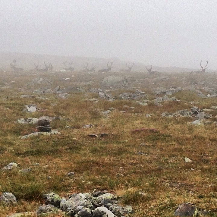 IMG_9093The vast landscapes conjure up folklore and fables. I imagine Viking gods, trolls or other magic creatures roaming this Earth. The absolute beauty and harsh realities of this place invoke a sense of mystery and mysticism. God or the gods’ presence can be felt – that is if you are looking. I take a backpack-free wander over sponge-like earth to seek them out, playfully climbing on steep loose stones in my search. I’m nearly certain I see the Norse god Odin on the face of a giant rock. Humbly, I decide to turn back as the winds pick up and the skies become black from an approaching storm. Wise choice he seems to murmur… Back on solid ground, a herd of reindeer suddenly appears – the first of many. Perhaps a sign of Odin’s approval?
