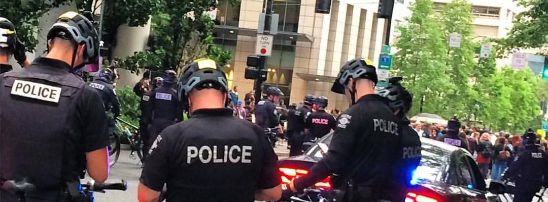 Meanwhile, the protesters were surrounded by dozens of police – thankfully on bicycles, somehow building a psychological sense of humanity, of approachability. We need this so much right now!!! They were kind-eyed and sympathetic. At least they gave the allusion so. Several protesters leaving the several hours’ protest thanked the police for their service as they walked away, giant signs calling to “End Police Violence Now” in tow. (I love Seattle for this!!)